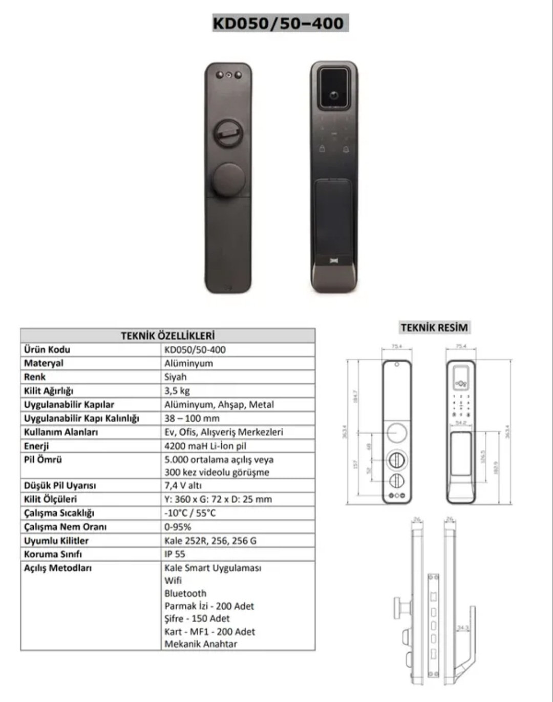 Model Kale KD050/50-400, Gövde Malzemesi Alüminyum Alaşım, Renk Siyah, Uyumlu Kapı Kalınlığı 38 – 100 mm, Koruma Sınıfı IP55 (Toz ve suya karşı dayanıklı),Parmak İzi Kapasitesi 200 adet,Şifre Kapasitesi 150 adet,Kart Kapasitesi 200 adet, Pil 4200 mAh Li-ion batarya, Uyumlu İç Kilit Kale 252R / 256 / 256G